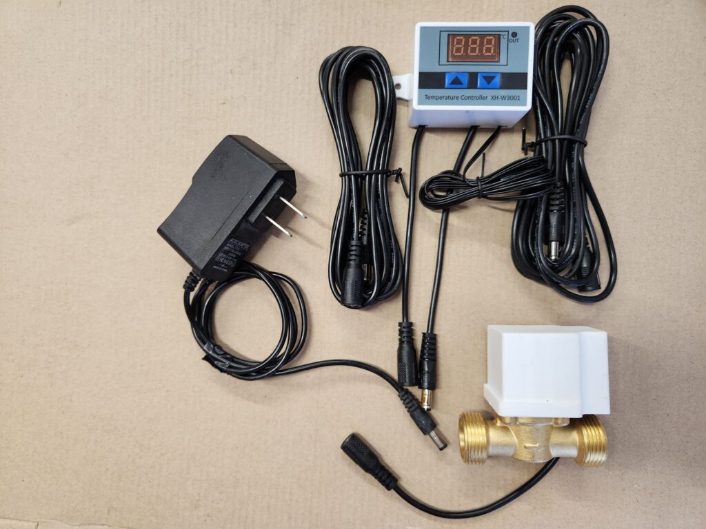 Power supply (12v). Brass solenoid valve with plastic cover. Temperature controller with sensor. Two 9′ (3m) power cables, and 4 (four) garden hose gaskets.
